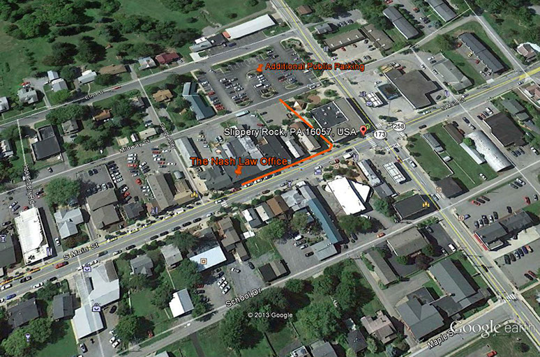 Free parking is always available in downtown Slippery Rock. There is street side parking on Main Street in additional to a large public parking lot behind the Nash Law Office. If parking in the larger public parking lot, our office is only a short walk as indicated on the map to the right.